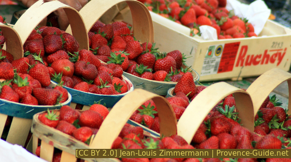 Paniers de fraises de Carpentras sur le marché d'Orange