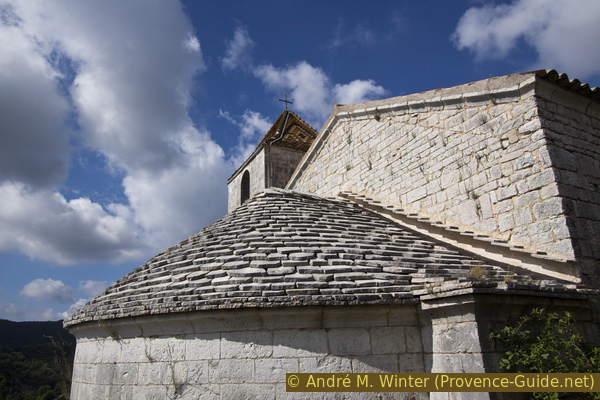 Les diverses parties des toits ont des couvertures datant des phases de construction: des lauzes sur le chevet, des tuiles rondes sur la partie surélevée de la nef et des tuiles vernissées sur le clocher. Ces dernières présentent une particularité sur les arêtes: elles sont surmontés d'un petit bulbe creux qui siffle quand souffle le mistral. On les appelle tuiles à loup parce qu'avec le vent, les animaux sauvages étaient susceptibles de descendre vers le village.